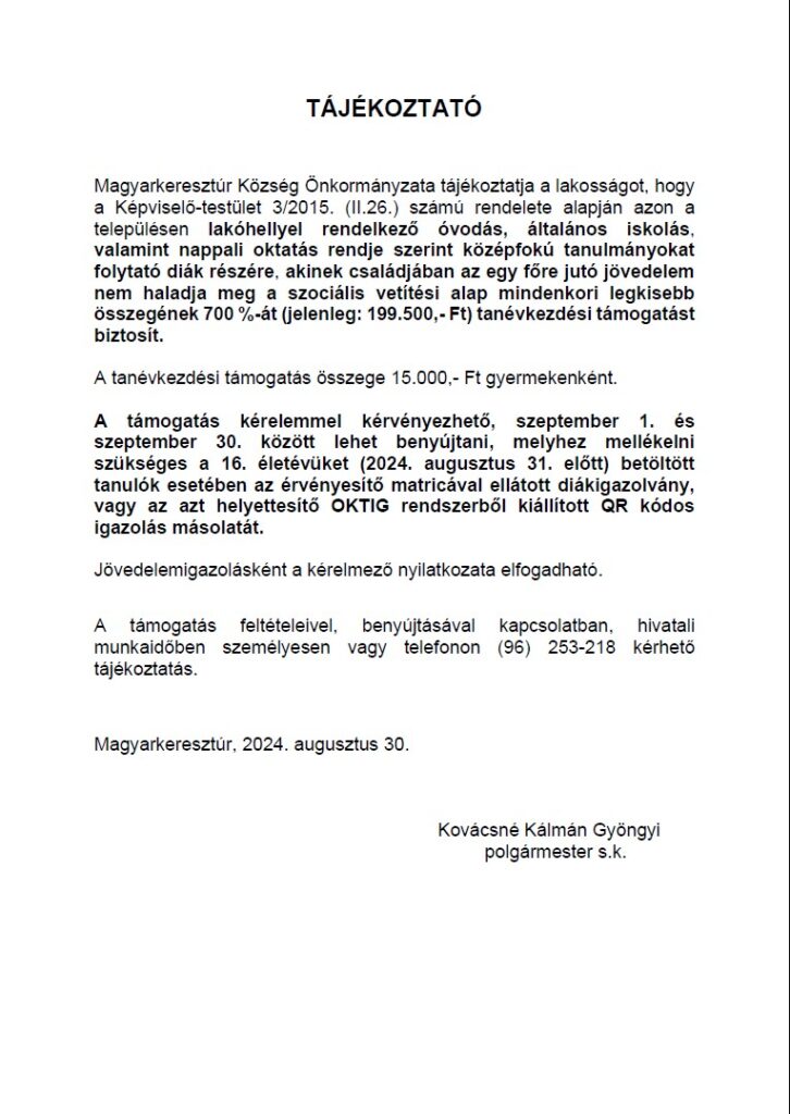 Posted on szeptember 2, 2024Posted in Aktualitás Tájékoztatási iskolakezdési támogatásról A támogatás igénybevételéhez szükséges nyomtatvány letöltése Tájékoztató iskola kezdési támogatásról Bejegyzés navigáció Kormányablak-busz ügyfélfogadás 2024.09.10.Bursa Hungarica Ösztöndíj pályázat 2025