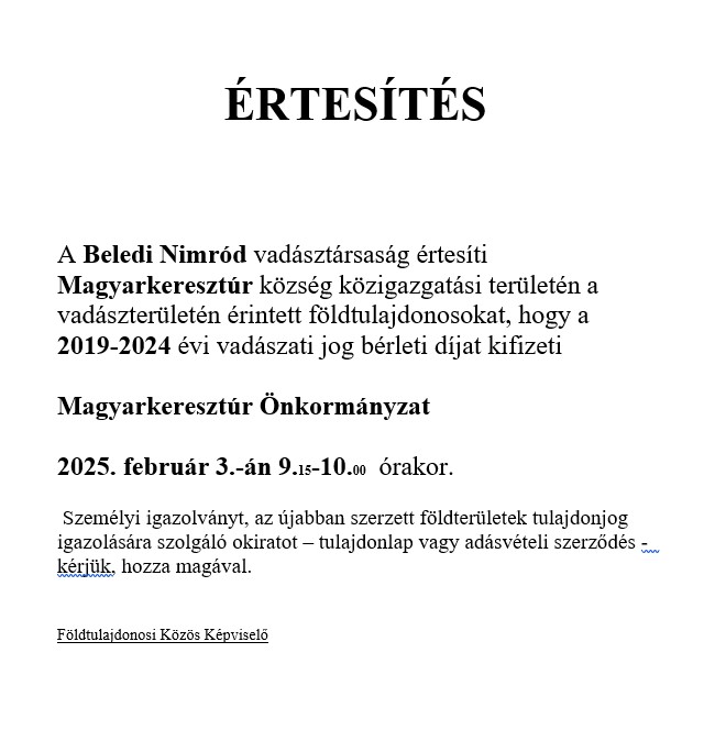 Posted on január 20, 2025Posted in Aktualitás 2019-2024 évi vadászati jog bérleti díjak kifizetése Bejegyzés navigáció Bursa Hungarica Ösztöndíj pályázat 2025Tájékoztatás ragadós száj- és körömfájás járványról