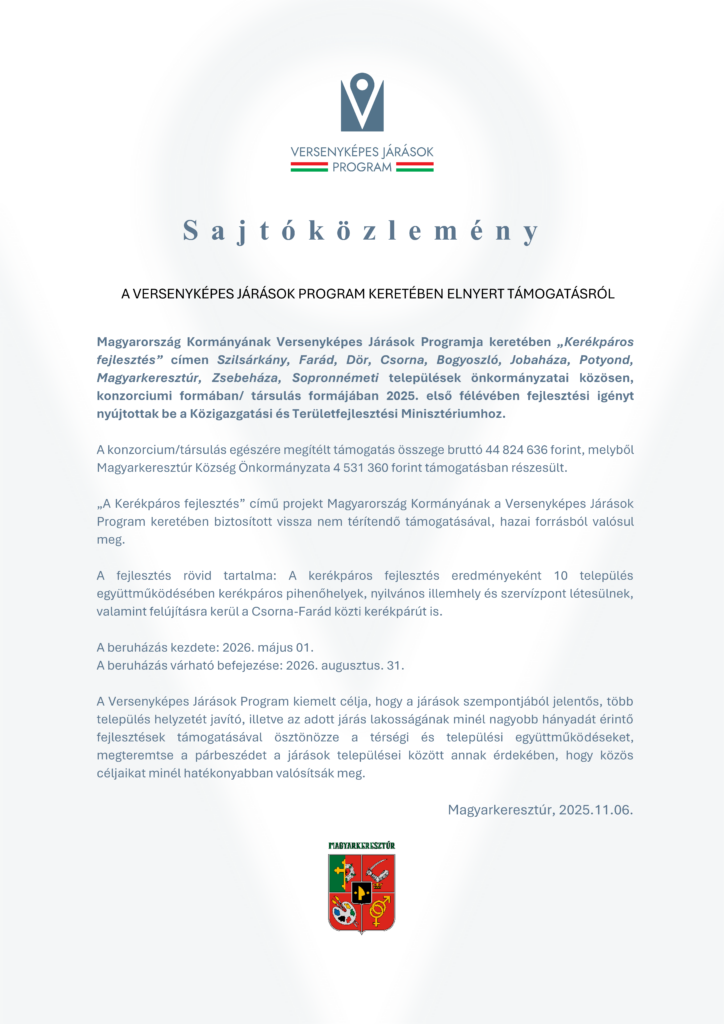 Posted on november 6, 2025Posted in Aktualitás Versenyképes Járások Program – Sajtóközlemény Bejegyzés navigáció BURSA HUNGARICA Ösztöndíj Pályázat 2026.Partnerségi hirdetmény és lakossági fórum 2026-01-12